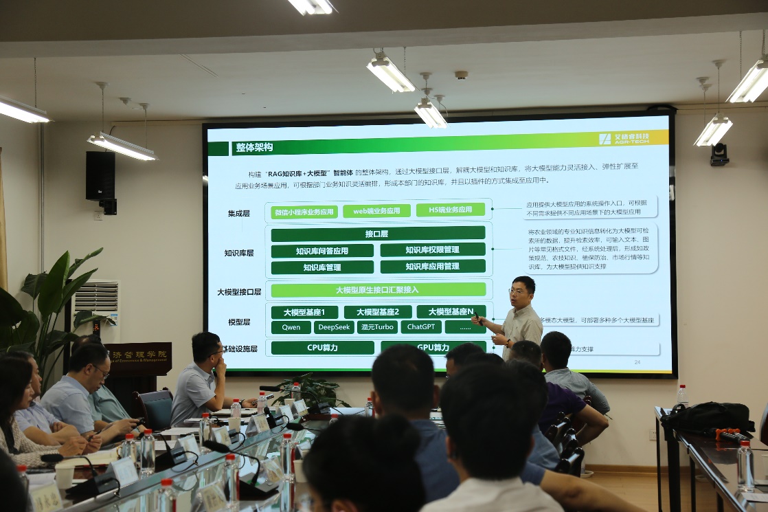 我校2015届生命科学学院校友、杭州艾格睿科技有限公司总经理高霈介绍了公司技术情况,讲解了大模型的技术路线和研发计划,着重介绍了多个大模型赋能农业的具体应用场景:如智能物联网平台、智能空间大数据平台、水肥排灌智能调度、植保无人机作业、AI农技咨询、农业行情判断以及智能农业生产管理,并结合实际案例展示技术落地成效。此外,高霈还围绕大模型后续迭代升级和场景推广应用,系统性提出可落地的解决方案,为后续的升级开发与产业应用提供清晰路径。并现场与学校签订了联合开发“后稷农业大模型”的协议。