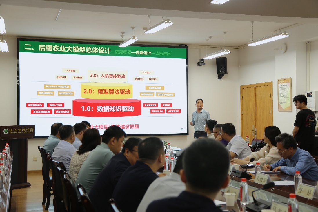 会上,项目负责人、西北农林科技大学西部农村发展研究中心主任、农业数智化现代产业学院院长阮俊虎教授介绍了“后稷农业大模型1.0”的研发背景、技术架构、未来规划、使用功能和应用场景。该模型充分发挥学校在旱区农业科研领域的学科优势,依托学校的海量高质量农业知识数据训练而成,深度融合农业专业知识,具备自然语言处理、计算机视觉、多模态等能力,可以实现农业文本语义理解、农业图片识别、农业知识问答、农业生产决策推理等多项功能。