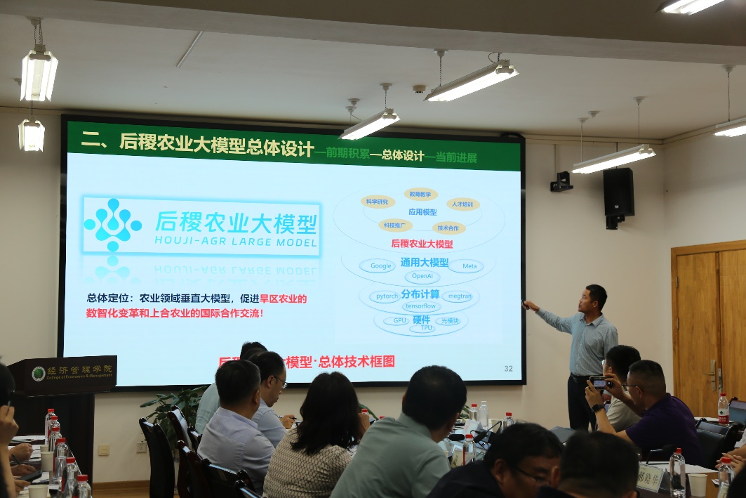 会上,项目负责人、西北农林科技大学西部农村发展研究中心主任、农业数智化现代产业学院院长阮俊虎教授介绍了“后稷农业大模型1.0”的研发背景、技术架构、未来规划、使用功能和应用场景。该模型充分发挥学校在旱区农业科研领域的学科优势,依托学校的海量高质量农业知识数据训练而成,深度融合农业专业知识,具备自然语言处理、计算机视觉、多模态等能力,可以实现农业文本语义理解、农业图片识别、农业知识问答、农业生产决策推理等多项功能。