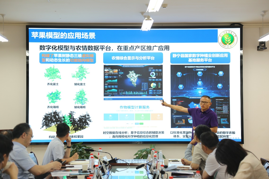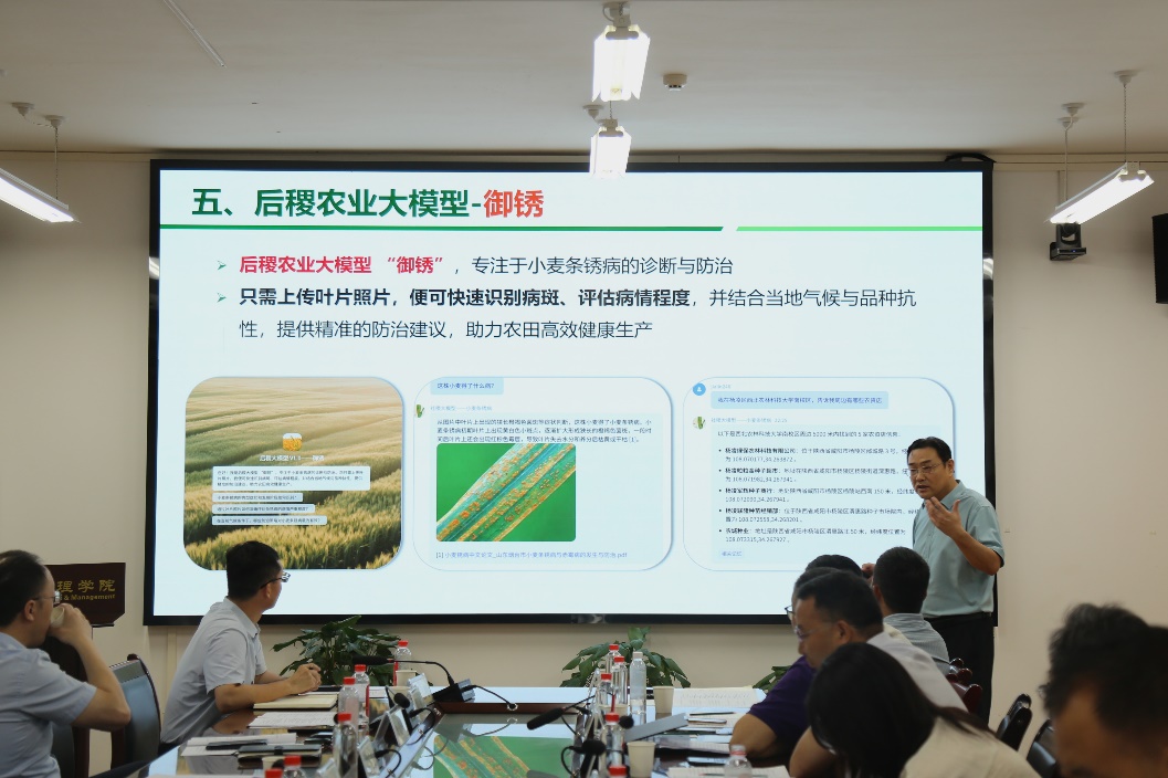 产学研研讨环节,学校植物保护学院院长郭军教授,国家苹果产业技术体系首席科学家、园艺学院张东教授,信息工程学院院长张宏鸣教授分别汇报了“后稷·御锈”(小麦条锈病)、“后稷·优果”(苹果种植)、“后稷·智牧”(肉牛养殖)三个大模型子应用的相关情况。