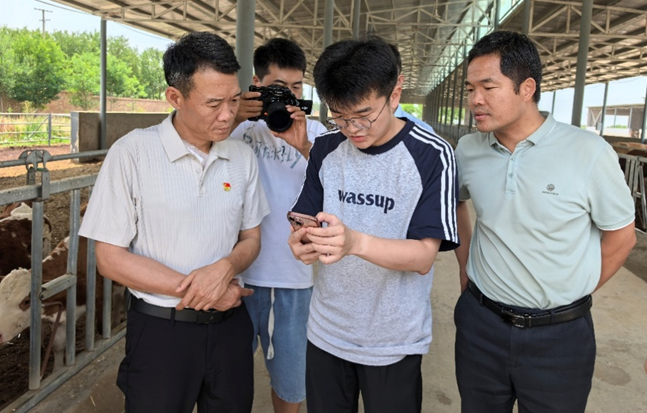 上午,团队实地前往肉牛养殖基地,查看智慧项圈的使用成效,团队成员现场演示智慧项圈的使用方法和监测系统的使用,围绕畜禽生长数据采集、环境监测等应用展开交流,直观了解牧业生产实际需求与痛点,为后续技术对接和场景开发筑牢实践根基。同时,团队成员演示了“后稷农业大模型”的智能问答助手平台在养殖场景中的初步应用,为科学养殖、智能问诊、管理决策提供技术支撑。