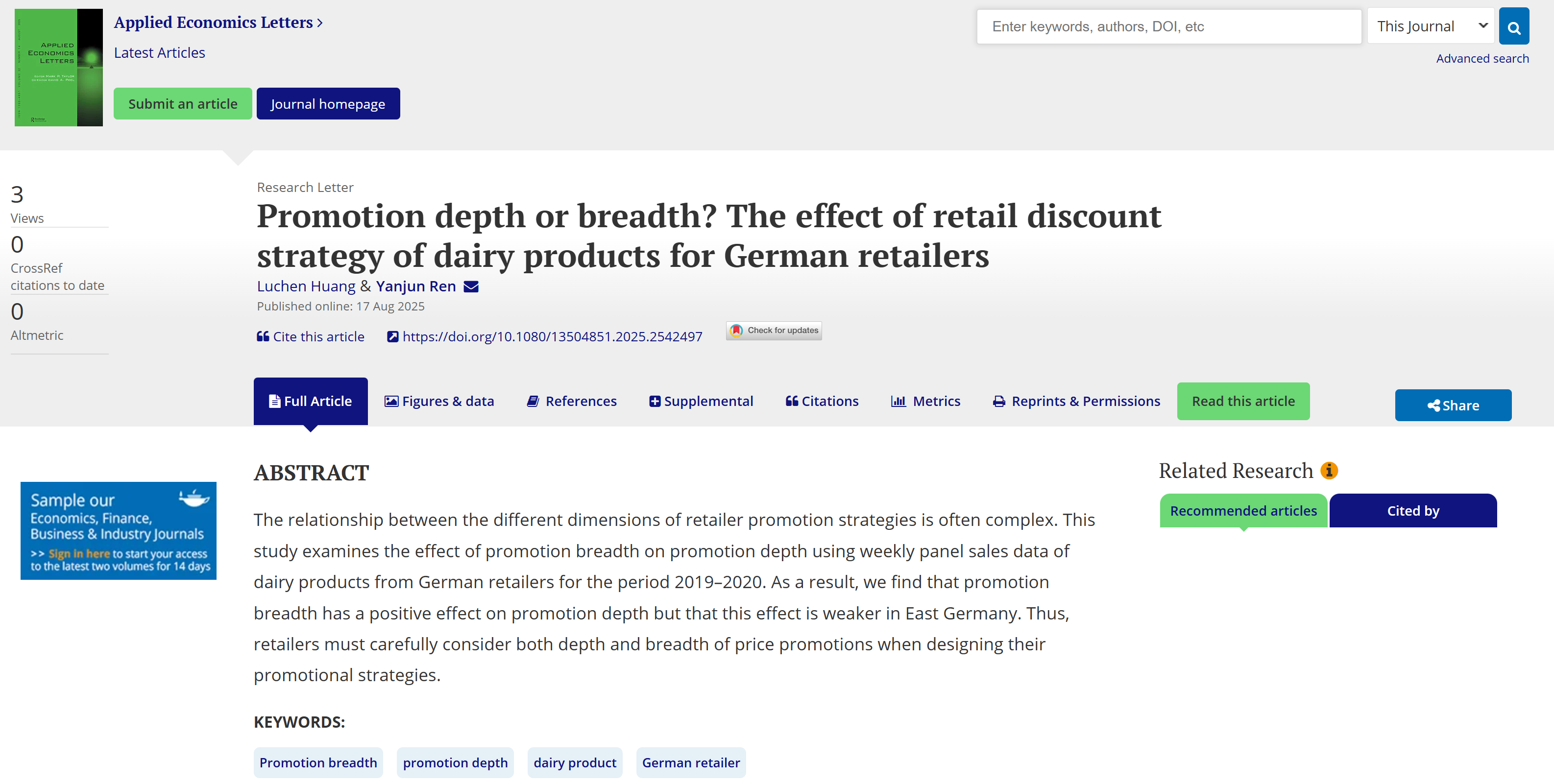近期,BB贝博艾弗森官网任彦军教授课题组在《Applied Economics Letters》发表最新研究成果,论文题目为“Promotion depth or breadth? The effect of retail discount strategy of dairy products for German retailer”。任彦军教授为论文通讯作者,黄禄臣博士生为论文第一作者。