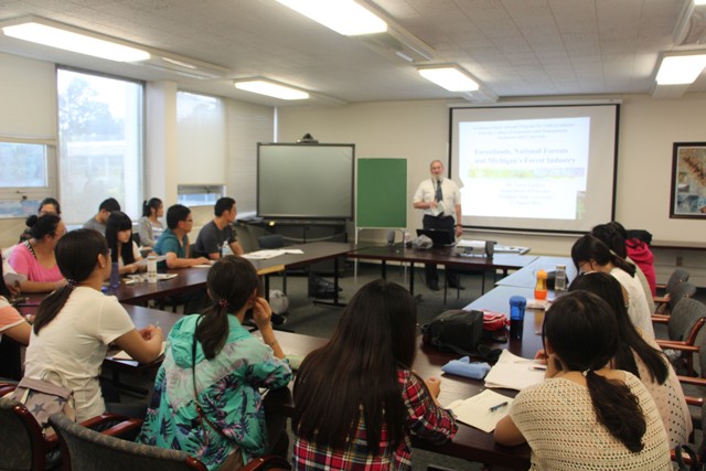 8月23日,在Larry Leefers教授的带领下,访学团成员集体学习了美国自然资源的管理政策和密歇根州的林业产业现状及其发展。随后,大家共同观看学习了美国林业百年发展史实纪录片《The Greatest Good》,纪录片分“为保留而战”、“建设保护系统”“繁荣时代”“利益最大化”四部分全面介绍了美国林业的发展史,Larry Leefers教授对影片进行了幽默风趣的讲解,使同学们对美国林业实现公私利益最大化与林业经济多功能的可持续发展性有了更加直观的体会。观看影像后,访学团学员结合中国森林木材开发使用保护情况,就中美林业发展现状及政策的相似性与差异性和Larry Leefers教授进行了交流。让同学们对美国林业政策运行及其实施效果有了更深的认识。