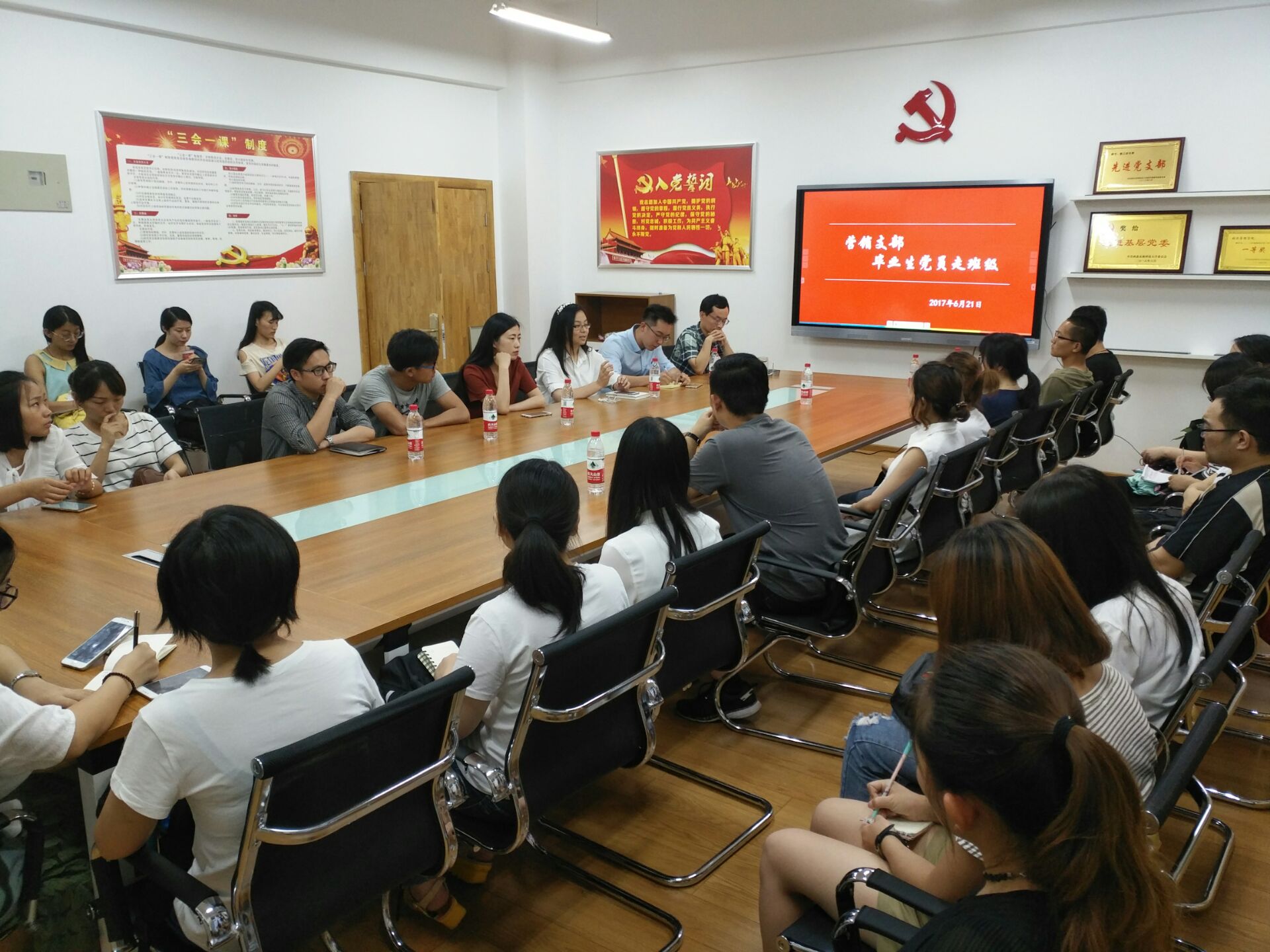 6月21日晚,营销支部在学院党员活动室举行优秀毕业生党员经验分享会,6名签约名企的优秀毕业生党员向即将面临求职择业的营销专业14级学弟学妹讲述自己的就业故事。营销141班班主任石宝峰副教授、营销132班班主任卢玮楠老师出席并为在场学生提出了中肯建议。