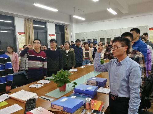 会议的第三项,支部书记张蚌蚌带领全体党员面向党旗进行庄严宣誓,对转正党员和新吸收入党同志表示祝贺,也对支部各位党员提出了殷切期望。最后,何华义、周自展、闫相伊三位同志总结发言,分别从自身角度谈了对此次会议的看法和体会,本次大会在严肃活泼的氛围中落下帷幕。