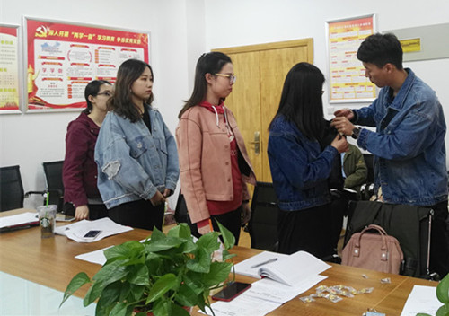 为了响应学院“亮身份、践承诺、树形象”主题实践活动安排,丁坤向支部成员介绍了“亮身份、践承诺、树形象”主题实践活动文件精神,并给支部党员和预备党员佩戴党徽,要求大家佩戴党徽,亮明身份,接受同学监督,积极发挥党员的先锋模范作用,切实做到热爱公益,乐于助人,积极组织并参加公益实践活动,践行党的宗旨。随后,丁坤带领支部全体成员面向党旗进行了庄严宣誓,重温入党誓词,明确责任担当,支部成员均签署了“亮身份、践承诺、树形象”主题实践活动承诺书,表达为人民服务的决心。