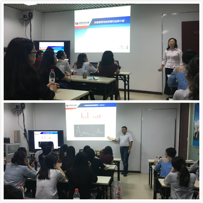 下午两点,实习队伍来到中投证券西安营业部参观学习,营业部郭总对中国中投证券的前身、发展做了简要介绍,随后客户总监于霏为大家带来了一场职业盛宴:关于财富管理与投资银行业,围绕决定成败三大要素——when、where、how,即什么时候投资,去哪投资、如何投资进行了全面的解读与讲解。报告中,围绕当前国民投资需求、投资理念、不同时期人民币币值变化的原因、上市公司的入市流程、金融机构利润来源等方面进行了全面的案例分析。报告结束后,于先生还对学生以后工作的选择提出了针对性建议,并热心的对大家提出的问题——如何进行短线长线的投资、飞单风险等进行了解答。