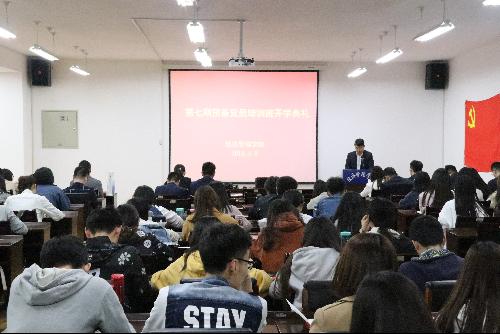 4月9日晚,经管学院在C401会议室举办第七期预备党员培训班开学典礼,党委副书记温晓林出席并讲话,学工秘书张静、党课班主任梁润雅、吴春生、各学生党支部书记及第七期预备党员培训班全体学员到场参加,会议由马奕颜主持。