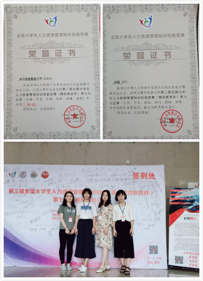 近日,第三届全国大学生人力资源管理知识技能竞赛(精创教育杯)第七赛区(甘肃、宁夏、青海、陕西、西藏、新疆))于6月23、24日在陕西宝鸡文理学院隆重举行。我校经管学院工商管理专业学生左艺辉、王若琦、任丽君、常心爱四名成员在指导老师刘超、梁洪松带领下代表我校参赛。