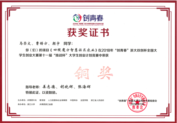 11月4日,由共青团中央、教育部、人力资源和社会保障部、中国科协、全国学联、浙江省人民政府共同主办的2018年“创青春”浙大双创杯全国大学生创业大赛在浙江大学落下帷幕。由贝博官网姜志德教授指导的学生创业项目--《四稷魔方智慧社区农业》经历校赛、省赛一路过关斩将最终荣获国赛铜奖。