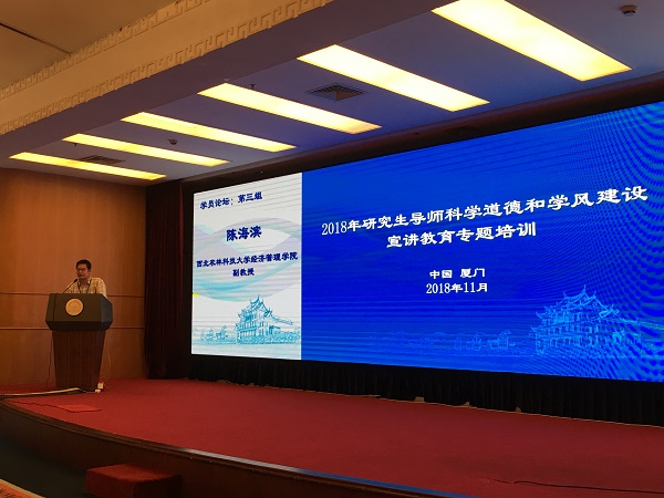 11月6日—9日,由全国科学道德和学风建设宣讲教育领导小组主办,福建省科协、福建省教育厅、厦门大学承办的“第一期研究生导师科学道德和学风建设宣讲教育专题培训”在福建省厦门市举行。来自教育部直属高校、中科院各科研院所及中科院大学、社科院各科研院所及社科院大学130余名近两年新晋研究生导师参加。贝博官网2017年新晋硕士生导师陈海滨副教授代表学校参加了专题培训。