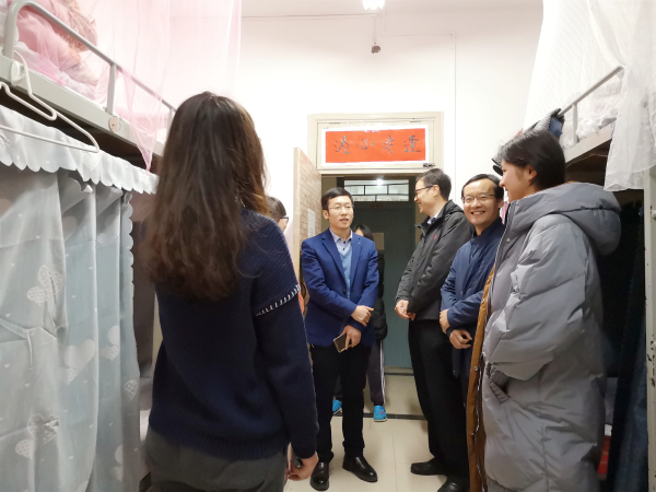新学期伊始,为引导学生以新的精神风貌面对新征程,做好学生宿舍阵地建设工作,帮助学生培养良好生活习惯。2月25日晚,学院党委副书记张军驰,副院长王云峰、石宝峰一行带队检查了北校区学生宿舍,了解、关心学生的假期学习生活情况,并对宿舍安全卫生、寝室风貌等方面进行走访检查,学工秘书张静、各年级辅导员参加此次宿舍检查。