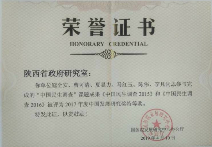 近日,从国务院发展研究中心办公厅获悉,贝博官网夏显力教授、马红玉副教授和陈伟副教授与陕西省政府研究室联合参与完成的“中国民生调查”课题成果《中国民生调查2015》和《中国民生调查2016》获得2017年度中国发展研究奖特等奖。