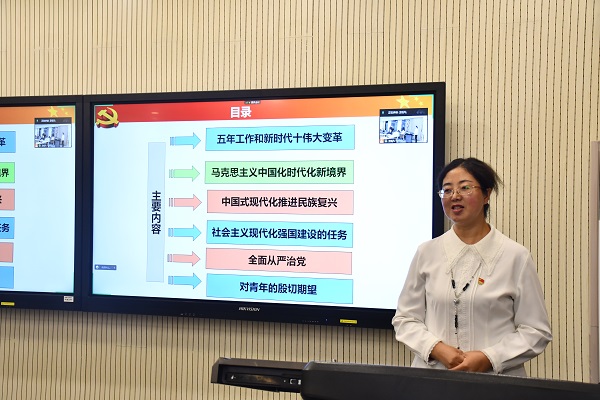 张丽以题为《迈上全面建设社会主义现代化国家新征程——深入学习贯彻党的二十大精神》为大家做专题宣讲,从大会主题、过去5年的工作和新时代十年伟大变革、马克思主义中国化时代化新境界、中国式现代化推进民族复兴、社会主义现代化强国建设的任务、全面从严治党和对青年的殷切期望等方面,深刻阐述了建党精神32个字的时代意义,对党的二十大提出的新思想新论断、作出的新部署新要求,作了全面、系统、深入的阐释解读。王赟作总结讲话,他对全体党员提出三点要求,一是切实强化学思践悟,增强学习自觉,二是切实强化组织安排,进行周密部署,三是切实强化学用结合,坚持知行合一。